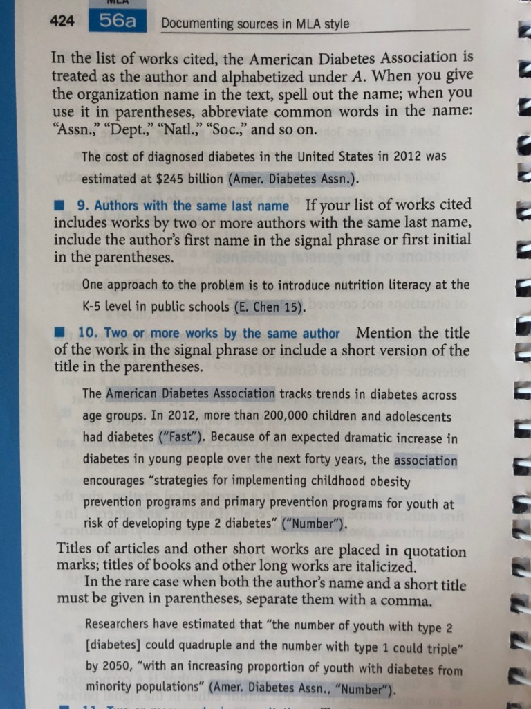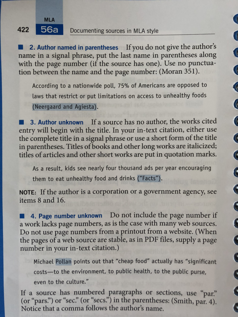 - pg 422 – how to put authors’ names in parentheses, details about what to do if the author is unknown, and an explanation of what to do if there are numbered paragraphs or sections but no page numbers